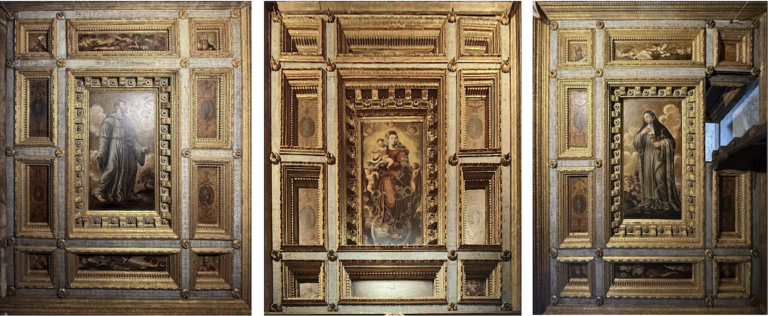 The barco features a wooden floor supported by two finely carved stone pillars adorned with candelabra motifs, along with a pierced wooden balustrade made up of nine circular panels. The entire underside of the floor is lavishly decorated with carved and gilded motifs—plant scrolls and rosettes set against a blue background. In each of its three sections is a large central canvas: the middle depicts the Madonna and Child, the canal-side shows Saint Francis, and the calle-side portrays Saint Clare of Assisi. Each of these larger works is encircled by ten smaller paintings depicting full-length saints and half-length bishops and prophets. Their arrangement follows a precise, symmetrical pattern: two rectangular paintings along each long side, two more along each short side, and four square paintings placed in the corners. Together, they form a harmonious and well-balanced composition around each of the three main canvases.
