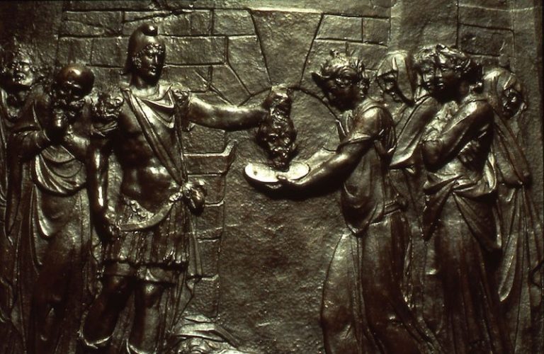 In 1545, the Tuscan sculptor and architect Jacopo Sansovino designed bronze reliefs for the cover of the baptismal font, and his pupils, Tiziano Minio and Desiderio da Firenze, completed the work from their master’s designs. These bronze reliefs depict scenes from the Life of Saint John the Baptist, the Four Evangelists, and the Baptism of Christ; the clouds, mountains, and foliage of their landscape settings reflect the pictorial aspect of Sansovino’s art, recalling his close relationship with Titian.