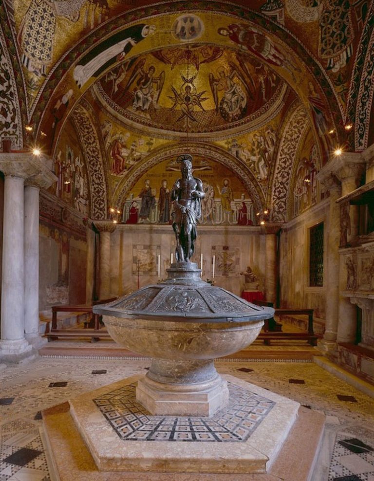 The Baptistery of San Marco was created from an area on the south side of the church that was once a frescoed portico where baptisms would take place. Its present form, separated from the church and with its own entrance, dates to the time of Doge Giovanni Soranzo (reigned 1312 – 1328), who is buried there, along with Doge Andrea Dandolo (reigned 1343 – 1354). It consists of a vaulted anteroom and the baptistery proper with its central font. During the fourteenth-century renovation of the space, the frescoes were replaced with mosaics that depict scenes from the life of Saint John the Baptist and from the early years of Christ’s life.