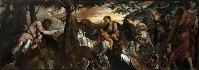 The three canvases were executed in two different phases: Saint Roch Healing the Animals was completed in 1567, whereas the Capture of Saint Roch at the Battle of Montpellier and Saint Roch in the Wilderness date to 1575-77. In the earliest of these works, Saint Roch offers his curative blessing to wild animals. The first among these is the lion, the symbol of Venice as if to affirm the Republic’s special protection by the saint. The scene of the Capture contrasts greatly with the bucolic Healing. Accused of being a spy, Saint Roch is arrested by soldiers and subsequently imprisoned. Tintoretto takes an inventive approach to depicting the event, imagining the capture as an unusually realistic battle scene, with hurtling bodies and horses tossed into the air by a violent explosion at the right. The third among these works, Saint Roch in the Wilderness, was primarily executed by Paolo Fiammingo, a Flemish artist then active in Tintoretto’s workshop and an expert in landscape painting. In the foreground, Saint Roch reclines in prayer as his faithful dog emerges from behind the hill on the right, carrying a loaf of bread in its mouth to feed the saint.
