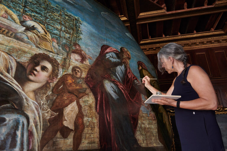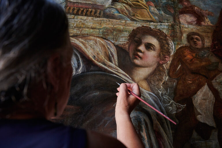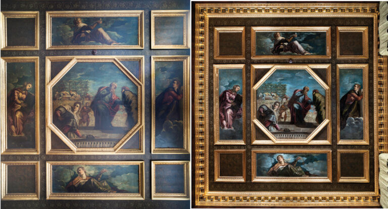 Save Venice funded the conservation of Tintoretto’s ceiling paintings in the Room of the Inquisitors in 2018 on the occasion of the Tintoretto 500 anniversary. The paintings were covered in thick layers of oxidized varnishes and heavy overpainting from previous conservation attempts. Conservator Gea Storace of the Corest firm gradually thinned and removed these non-original surface residues, revealing Tintoretto’s vibrant color palette and restoring greater legibility of the details.