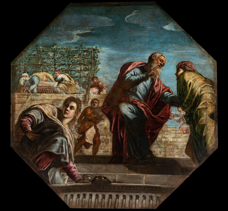 The octagonal central ceiling canvas depicts The Return of the Prodigal Son, which recounts the moving story on the possibility of mercy, reconciliation, and redemption. This episode’s presence must have been intended to encourage criminals to repent and return to the good graces of the Venetian government. The scene is surrounded by four allegorical figures of the virtues Faith, Justice, Fortitude, and Morality, which were designed by Jacopo but largely executed by his workshop.