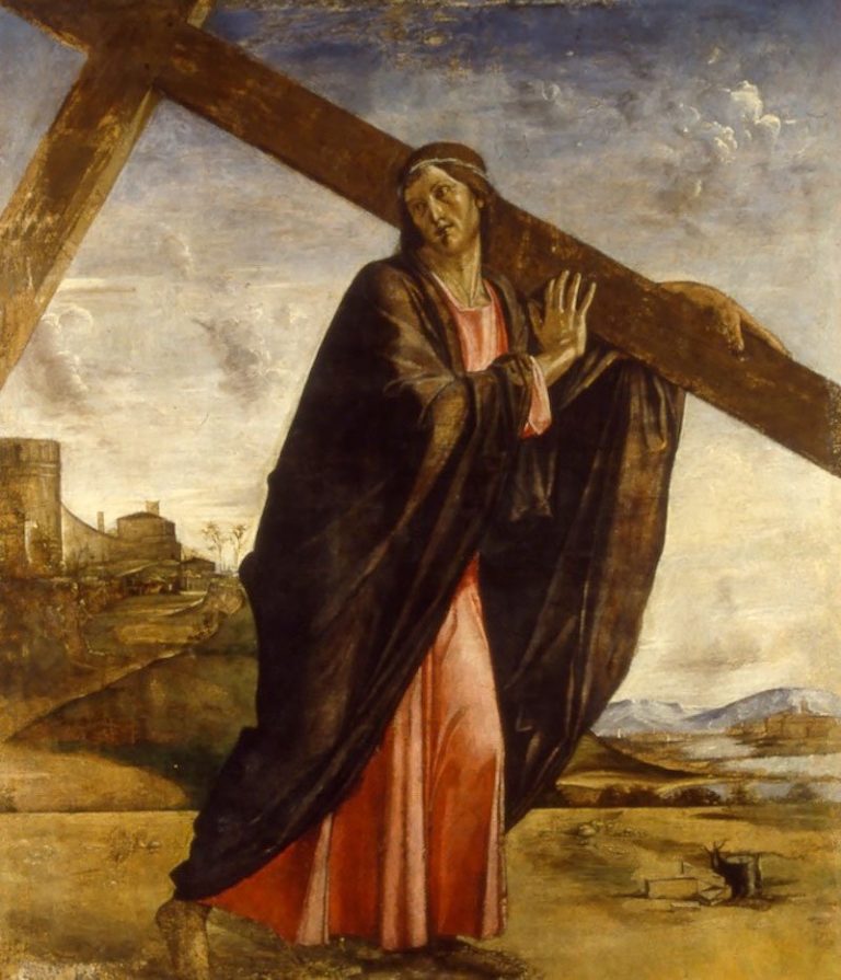 In light of its size, shape, and use of a canvas support, Alvise Vivarini’s Christ Carrying the Cross is likely to have been used as a devotional banner carried in religious processions. In the painting Christ bears his cross alone through a sparse landscape with low mountains in the distance. The tree stump to the right of Christ alludes to the tree from which the cross was cut and symbolizes the savior’s truncated life. The walled citadel in the background to the left seems to recall the fortified medieval towns of the Veneto. Considering the probable function of the work, the full-length, monumental representation of Christ, who glances backward over his shoulder, would have appeared to lead the procession that followed behind the standard bearer, heightening the devotional aspect of participation in such an event.