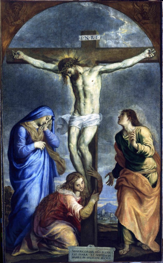 The variety of poses and emotions depicted reflects Salviati’s attention to the significance of figural action: the weeping Virgin Mary on the left, her head resting in her hand, enacts her maternal sorrow; Mary Magdalene, who had the privilege of anointing the body of Christ, tenderly embraces the cross at his feet; Saint John the Evangelist, instead, looks up in despair and disbelief at the crucified Christ. The profile of the canvas itself, curved at the top, indicates that it likely served as an altarpiece.