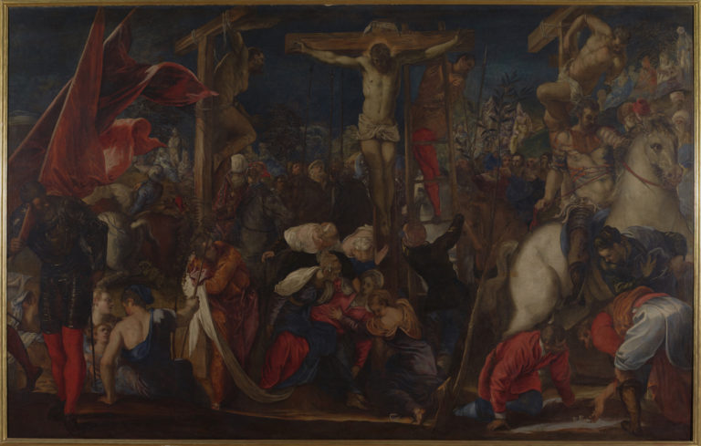 At the apex of this chaotic scene, Christ-on-the-Cross is illuminated at top-center with a glowing halo, and his body appears more noticeably at peace in contrast with the other figures. A subtly rendered spear wound on Christ’s torso intimates that he is already dead, which is further confirmed by the figure of Mary at the base of the Cross, who has fainted and is being held up by her companions. Tintoretto includes references to other events surrounding the episode of the Crucifixion as well, such as the Roman soldiers casting lots for Christ’s tunic in the right foreground. Out of the background’s darkness, the artist masterfully uses light to highlight not just the figure of Christ but also one of the two thieves on the cross as well as the centurion, who are both saved after declaring Christ the Son of God.