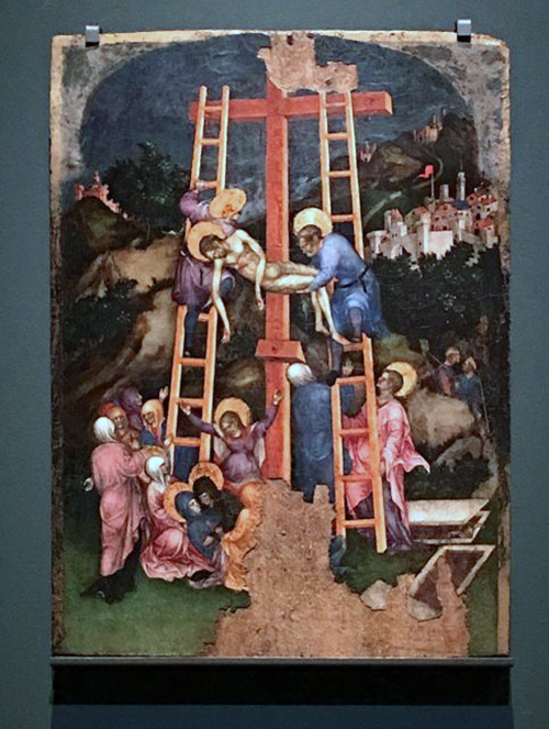 This small panel painting depicting the removal of the body of Christ from the cross was previously relegated to storage due to its poor condition. It was restored in time to be featured in the 2016 Accademia exhibition dedicated to the artist: Il Paradiso riconquistato. Trame d’oro e colore nella pittura di Michele Giambono.