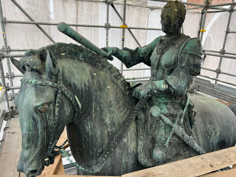 The statue suffers from ‘bronze disease,’ a form of corrosion that affects copper alloys. In this process, cuprous chloride reacts with water to form hydrochloric acid, which attacks and corrodes the bronze in its turn, thus speeding up the copper’s deterioration. Possibly on account of the difficulties involved in casting an equestrian statue of this size, Donatello split the monument into 36 pieces, thus increasing the structural instability of both the horse and its rider. The base, in trachyte and Istria stone, has also deteriorated due both to its constant exposure to the elements and to the corrosion of the cement mortar applied during an earlier restoration. Beginning in autumn 2025, comprehensive studies are taking place to determine the full extent of decay present in the monument in order to determine the best way to preserve the ensemble.