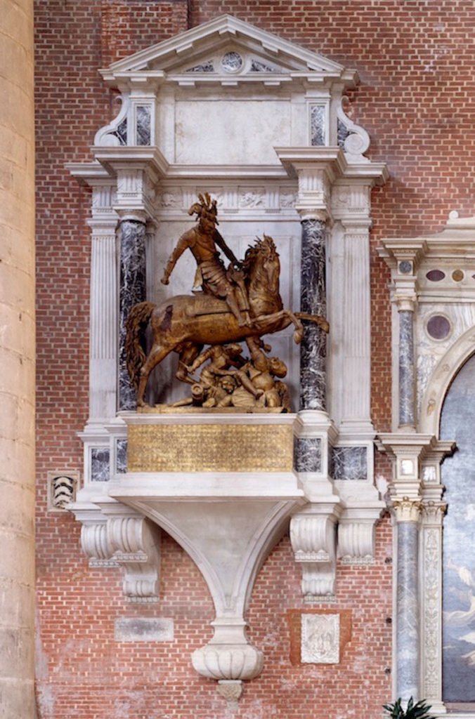 The tomb monument of Orazio Baglioni is mounted on the wall of the left aisle of Santi Giovanni e Paolo in a simple yet grandiose architectural setting. A military leader from Perugia in Umbria, Baglioni served as a mercenary captain, or condottiere, during Venice’s war with the Uskoks at Gradisca in northeastern Italy in 1613–1617. The Uskoks, a group of Christian refugees turned pirates, were settled in Croatia by the Austrians and entrusted with protecting the area from the Turks. After they became an uncontrolled menace to shipping in the Adriatic, Venice led the offensive to defeat the pirates. It was in this siege that Baglioni lost his life, and the Venetian Senate commissioned this monument to commemorate the fallen hero.