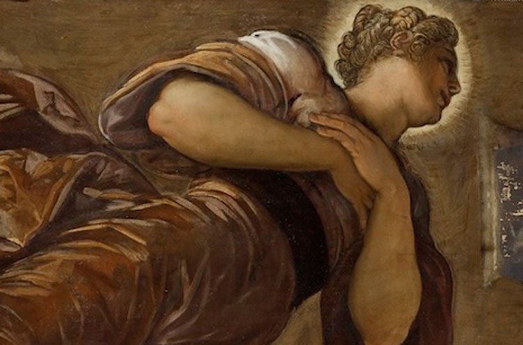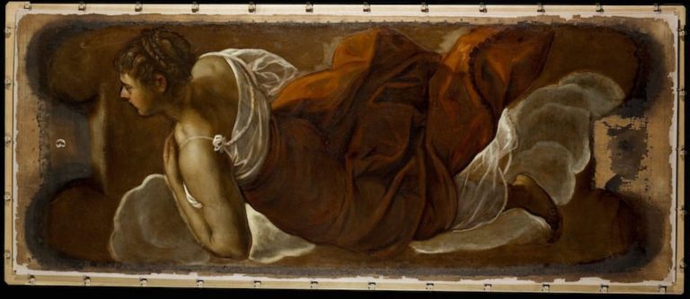 Surrounding his central painting of Saint Roch in Glory in the Sala dell’Albergo, Tintoretto added allegorical representations of the other major Venetian Scuole Grandi, as well as personifications of the virtues and seasons, as well as female figures. The two Female Figures in Flight are particularly striking for the rendering of their rich draperies, which flutter in the wind. The paintings were executed with the help of Tintoretto’s workshop assistants, and likely offered without charge following the Scuola’s acceptance of the central painting.