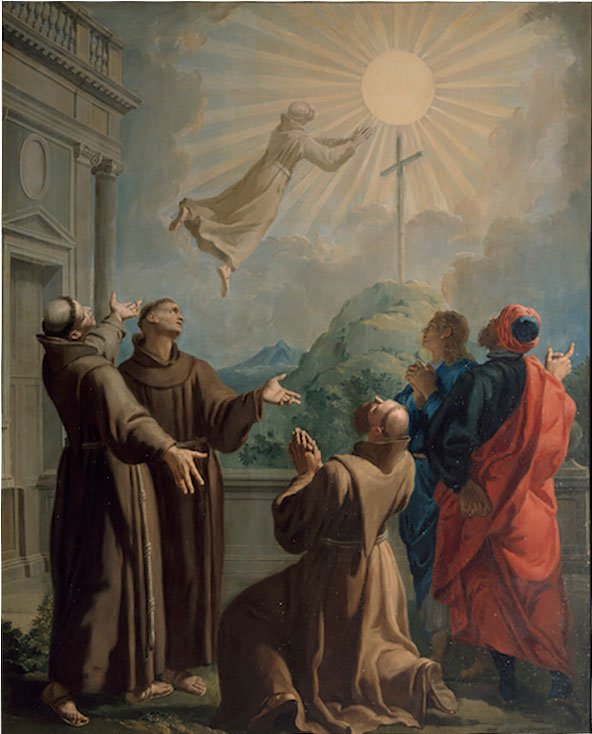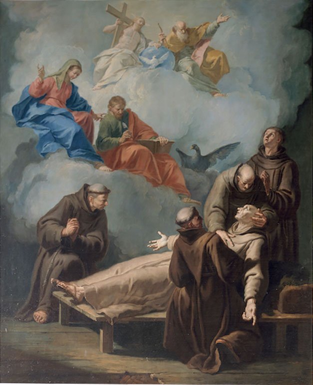 Around 1765 Francesco Fontebasso painted a series of four paintings that depict scenes from the life of Saint Peter of Alcantara, a Spanish Franciscan who lived during the early sixteenth century. The saint preached mostly to the poor and made a journey from Spain to Rome, barefoot, to ask Pope Julius III to found convents for the poor in Spain. Fontebasso’s four paintings decorate the Giustinian dei Vescovi Chapel, which is dedicated to Saint Peter of Alcantara and located off of the right transept of the church of San Francesco della Vigna.