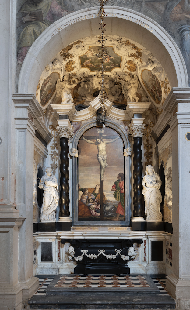 On February 4th, 1709, the chapel was ceded to an order of nuns dedicated to Saint Joseph known as the Congregazione delle Dame di San Giuseppe. According to the agreement, the nuns were allowed to renovate the whole chapel, except for Veronese’s Crucifixion, which “has to remain above the altar and cannot be moved.” The inscription above the altar, dating to 1710, commemorates the nuns’ patronage. The chapel was ambitiously redecorated in a Baroque style using colorful marbles, ornate stuccowork, frescoes, sculptures, and reliefs. The large statues of Saint Joseph and Saint Anne that adorn the altar, along with the oval reliefs on the walls, are attributed to sculptor Pietro Baratta.