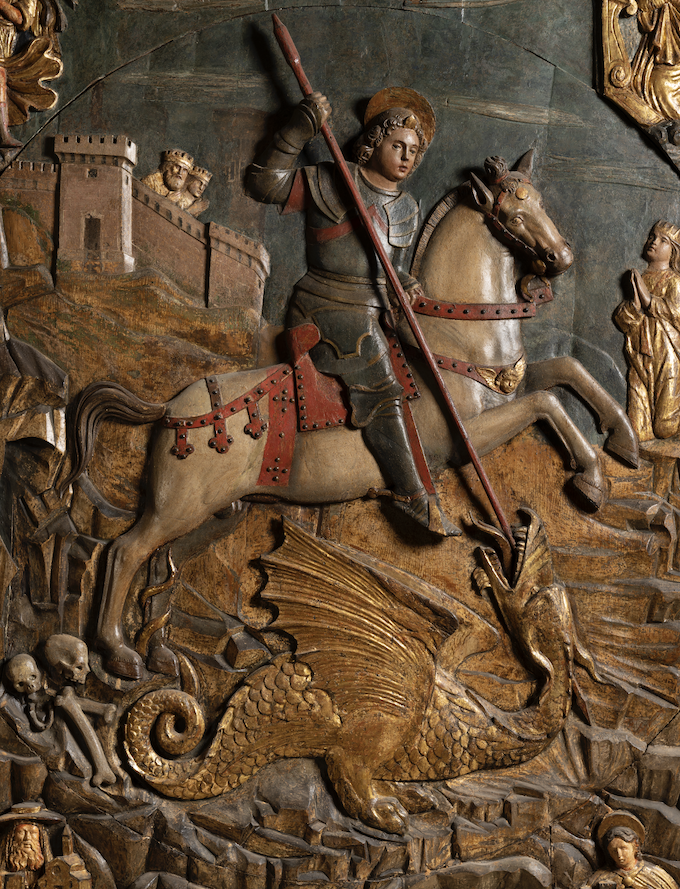 The duel unfolds within a foreboding landscape strewn with bones and skulls, a stark reminder of the dragon’s reign of terror. Against this macabre setting, George’s magnificent steed is depicted with its forelegs suspended in mid-air as the saint thrusts his lance with decisive force—entering the monster’s gaping, horrific jaws and emerging through the nape. The once-ferocious dragon is here divested of its menace: its poisonous breath extinguished, its flattened ears signaling submission and defeat. To the left, the fortified city of Selene anchors the scene, its walls populated by the king and queen, who raise their hands in prayerful witness to the Christian knight’s triumph and the salvation of their daughter. This juxtaposition of violence and divine deliverance not only heightens the drama of the composition but also underscores the moral and theological message of the saint’s victory over evil.