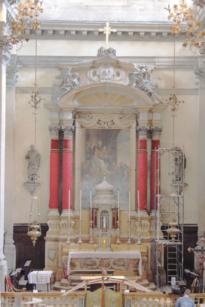 The altar dates to the church’s eighteenth century reconstruction, and is the work of an unidentified Venetian sculptor in the transition period from Rococo to Neoclassicism. The sculptural angels that adorn the altar are particularly impressive in their execution, from the fine detail in the feathers of their wings to the expressive folds of their draperies.