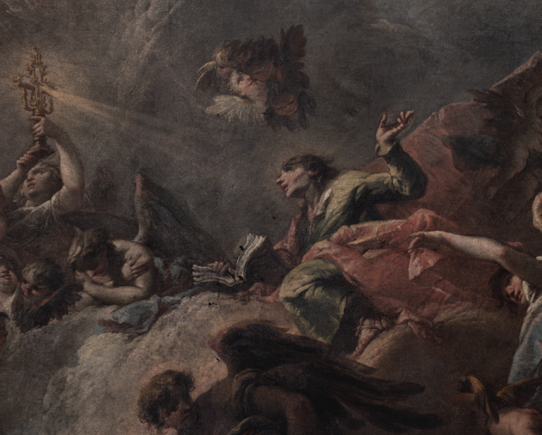The painting is obscured by a thick layer of non-original surface residues, including grime, dust, darkened oxidized varnish, and unsightly areas of chromatically altered overpainting from previous restorations. These layers will be carefully thinned and removed. Additionally, the canvas exhibits areas of paint loss, which will require integration using reversible conservation paints. Once the canvas is taken down from the church’s ceiling, its structural integrity and tension will be assessed. If necessary, conservation measures such as strip lining and stretcher replacement will be considered to ensure its long-term stability.