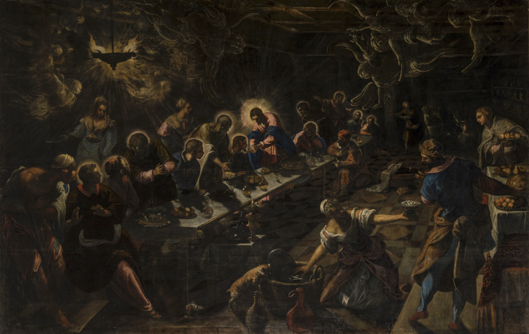 According to recent scholarship, Tintoretto should mainly be responsible for envisioning the composition, whereas the actual brushwork is currently attributed to his son Domenico, or the studio assistants. Regardless, this Last Supper remains one of the most inspired and visionary works of Tintoretto, with its non-material, swirling angelic forms that embody the ongoing miracle of the transubstantiation—the transformation of bread and wine into the body and blood of Christ. Indeed, Tintoretto’s artistic stature is evident in every detail of the picture, including the flickering lamp which was likely borrowed and readapted from Titian’s Crowning with Thorns (Alte Pinakothek, Munich), a painting Tintoretto probably acquired when his former master died in 1576.