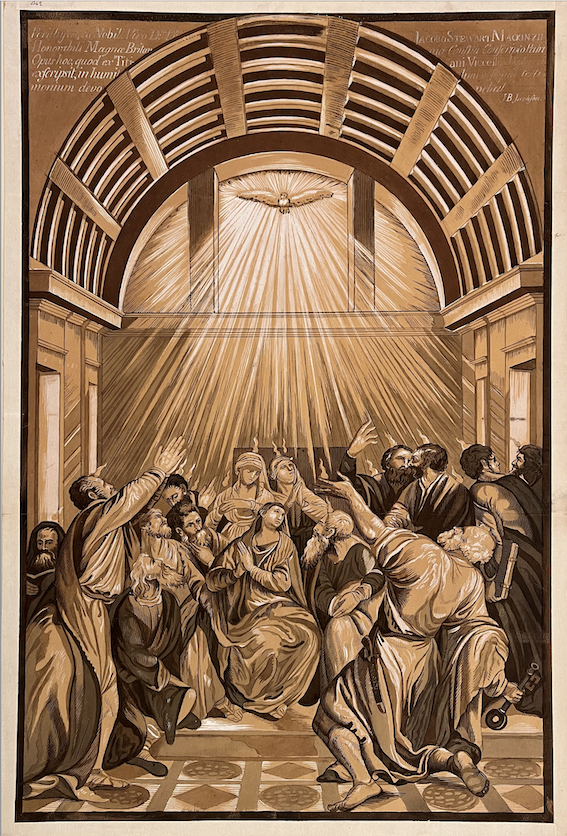 One remarkable item in the collection is a unique facsimile of Jackson’s chiaroscuro woodcut of the Pentecost, based on Titian’s work. This facsimile, created with meticulous brushwork and opaque watercolors, achieves an exceptionally high and convincing quality. An inscription by Cicogna on the reverse describes it as a “facsimile perfettissimo,” indicating that it was masterfully crafted by Pietro Pianton (d. 1864), the abbot of Santa Maria Misericordia. This abbey housed a significant collection of Jackson’s prints in the mid-19th century, though unfortunately, that collection has since been lost.