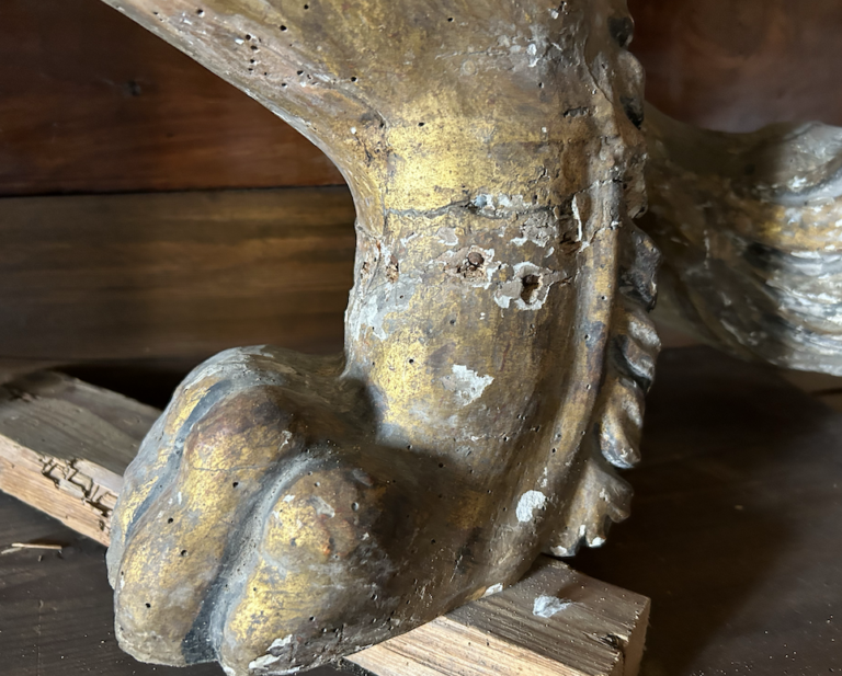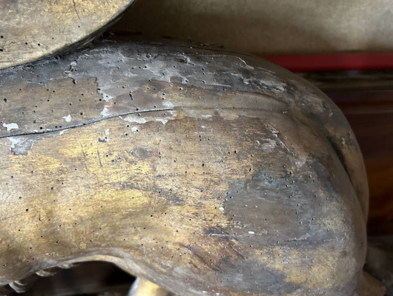 The wooden sculpture exhibited significant damage, including evidence of a past infestation by wood-boring insects, cracks, paint loss, and flaking. The entire body of the lion was coated with a thick layer of dirt and grime, along with deteriorated inpainting and varnish likely applied in the 1950s when the sculpture was moved to the library. During this previous treatment, clumsy dark lines were added, overly accentuating the feathering of the wings, the curly mane, and the lion’s facial features. Furthermore, the red paint outlining the lion’s eyes was so carelessly applied that it left streaks and drips, giving the appearance of improbable tears. Save Venice’s conservation treatment addressed all these issues, ensuring the structural stability of the sculpture and removing the non-original coatings to restore the artwork’s original appearance.