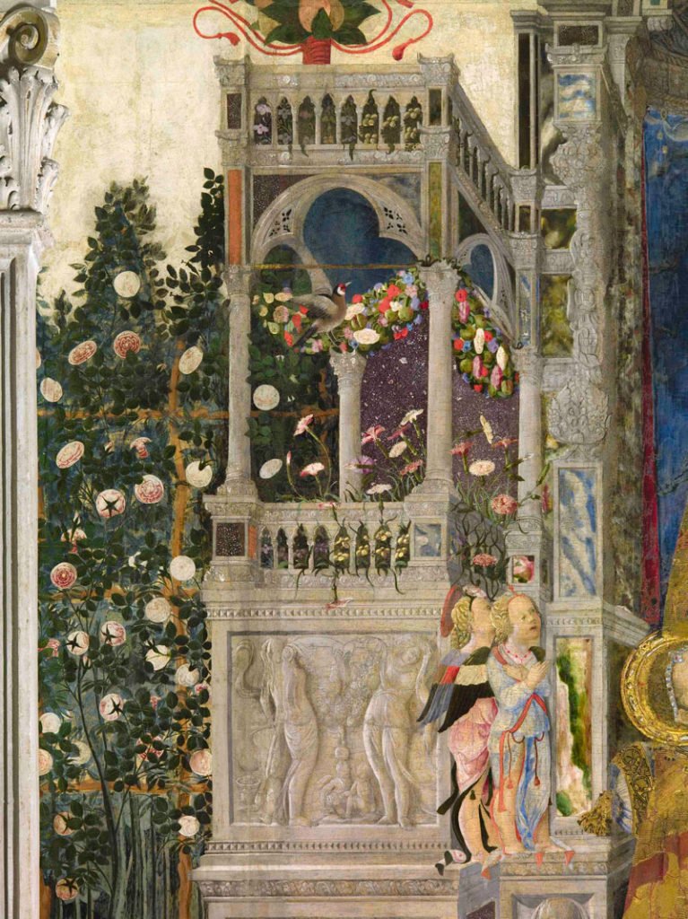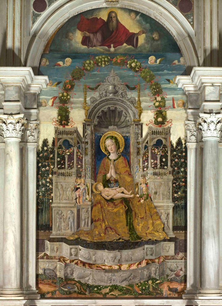 This painting is thought to have originally adorned a fifteenth-century altar owned by the Morosini family in the church of San Francesco della Vigna. Executed by the painter Antonio Falier da Negroponte during the 1460s, the altarpiece depicts the Virgin Mary seated upon an elaborately carved marble throne as she adores the Christ Child, who rests in her lap as four angels look on. The setting is enriched by the lush rose arbor that extends behind the throne, the decorative garland that forms an arch above it, and the many different species of birds that are depicted among the wildflowers in the foreground.
