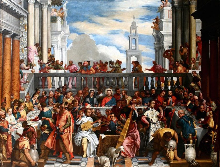 Paolo Veronese painted the Wedding Feast at Cana for the refectory of the monastery of San Giorgio Maggiore in 1562–1563. The magnificent painting, measuring more than thirty-two feet long and twenty-two feet tall, once filled the entire far wall of the monks’ dining hall. It depicts the wedding banquet at which Christ performed his first miracle, the transformation of water into wine. He is located along the central vertical axis of the composition, and his mother, the Virgin Mary, is seated on his right; their brilliant halos set them apart from the surrounding revelers. In 1797, this painting was among the many works of art seized by Napoleon’s troops and taken to France; today it remains on display in the Louvre.