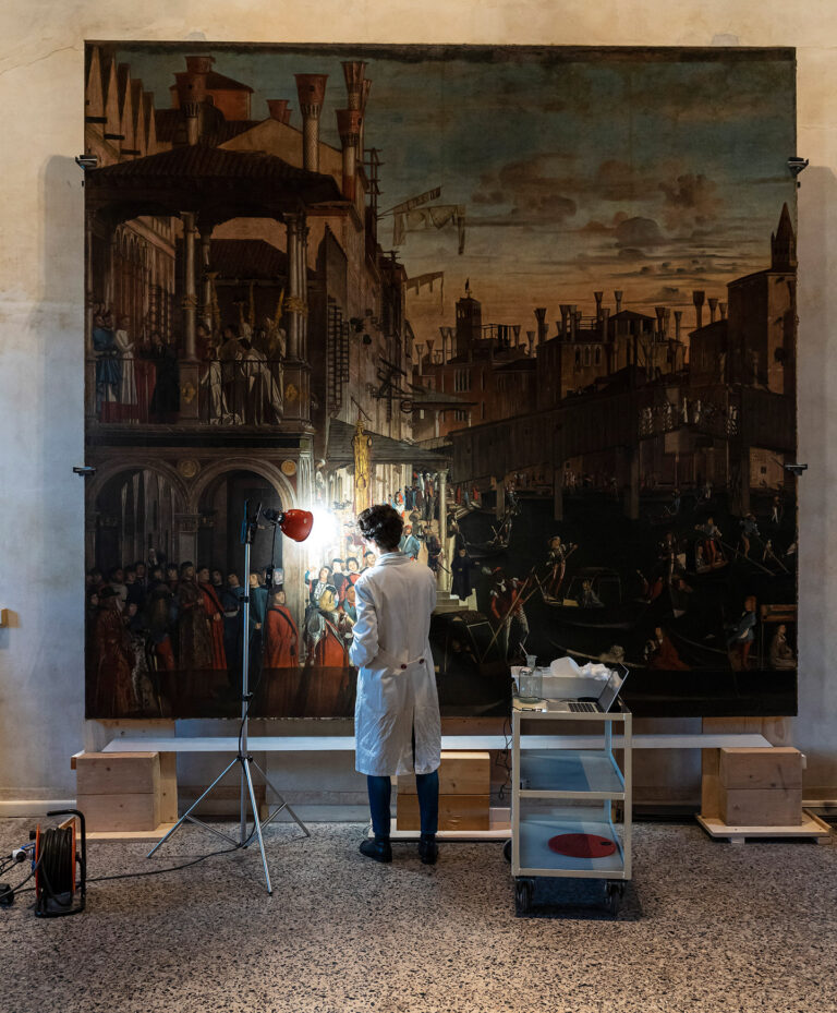 This iconic painting suffers from discolored varnish and chromatic alteration of the paint used for retouching in past conservation campaigns. The canvas is now undergoing conservation by the CBC firm at the Misericordia conservation lab in Venice. Surface dirt, old varnishes, and discolored inpainting and residues left from 19th-century conservation treatments are being thinned and removed. Losses will be filled using removable conservation paint and a final coat of protective varnish will be applied.