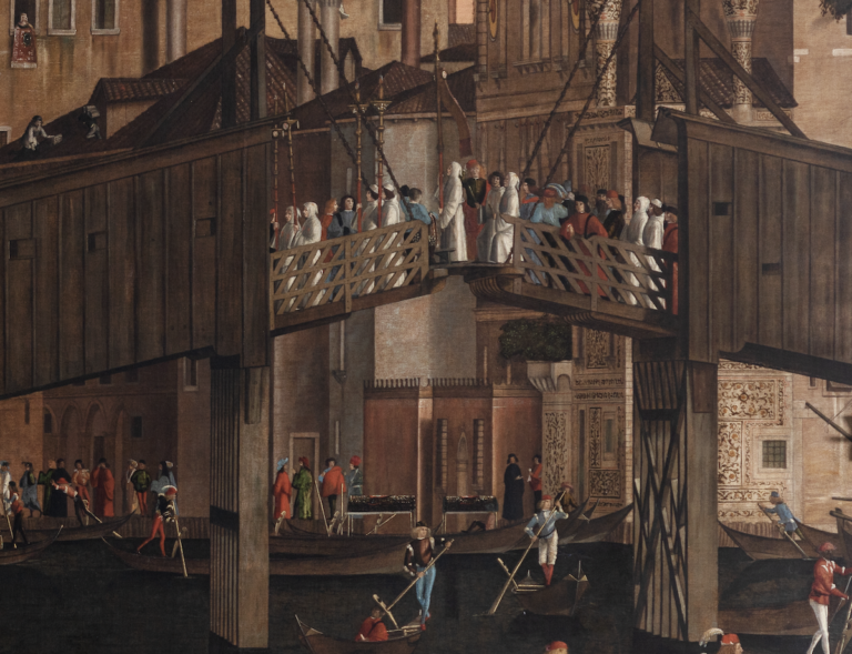 Beyond the Rio di San Silvestro, the bold perspectival rendering of the buildings draws our attention down the Riva del Vin, accompanied by the now silent voices of shopkeepers, errand boys, noblemen, and turbaned merchants, to the sign of the most famous inn of the time, the Locanda dello Sturion. The inn once stood next door to the Ufficio del Dazio del Vino, for which Carpaccio painted his Lion of Saint Mark, whose conservation Save Venice completed in 2021. The movement of the crowds is mirrored by the stream of gondolas passing by on the Grand Canal. At the center of the foreground, Carpaccio has portrayed an African gondolier, one of the mori (moors) who were employed during this time to row ferries such as the traghetto of the Camerlenghi, just beyond the Rialto bridge.