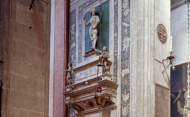 This funerary monument at the church of the Frari celebrates Venetian patrician Melchiorre Trevisan’s distinguished career as a naval commander for the Venetian Republic. While serving as commander of the galleys of Romania in 1479, he received a relic of Christ’s blood, which he donated to the Frari upon his return to Venice. As a gesture of gratitude for the precious relic, the friars ceded the chapel of Saint Michael to Trevisan and his descendants.