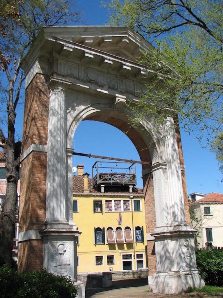 This impressive arch, located in the public gardens (Giardini Pubblici) of Castello, was once part of the church of Saint Anthony Abbot; the church was demolished in 1810 to make room for the park, which was designed by Gianmaria Selva. Among the artistic works salvaged from the church was the arched entrance to a chapel dedicated to the Madonna, commissioned by Doge Pietro Lando (ruled 1538–1545). The arch is framed by two engaged fluted columns that rise to support an entablature with a Doric frieze; winged victories fill the spandrels, and groups of trophies decorate the tall pedestals of the columns. The entire structure is topped with a projecting triangular pediment. The arch is traditionally believed to be the work of Veronese architect Michele Sanmicheli, who was active in Venice from 1529 to 1569.