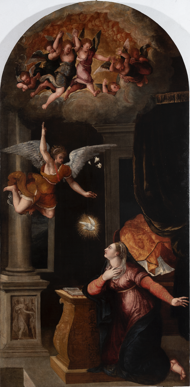 The chapel’s altarpiece represents the Annunciation of the Virgin. Traditionally, the painting was attributed to Matteo Ingoli, but the current conservation treatment tends not to support that hypothesis. Mary is shown in her temple-like bedroom as she kneels at her prie-dieu and receives the visit of the Angel Gabriel and the Holy Spirit in the form of a white dove. Here the artist depicts the very moment of the Incarnation when Mary “was found with child through the Holy Spirit” (Matthew 1:18). Two gold-plated angels holding palms are carved in the spandrels that flank the arch of the altar frame, whereas the altar front shows a beautiful bas-relief of the Annunciation in colored marbles.