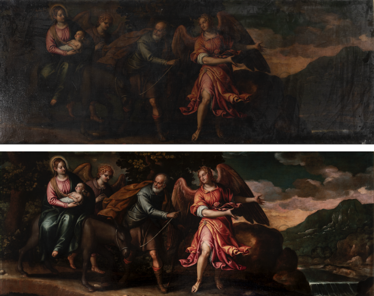 Each painting in the Virgin Annunciate (Lando) Chapel was covered with a thick layer of surface dirt and grime, as well as oxidized varnish, obstructing the original details and colors. During conservation treatment, these non-original layers were carefully thinned and removed, together with any heavy overpainting from previous restoration attempts. Any losses to the pictorial surface was filled using removable conservation paints before a final layer of protective varnish was applied. The cleaning process revealed that the altarpiece depicting the Annunciation was not painted by Matteo Ingoli, as previously thought.