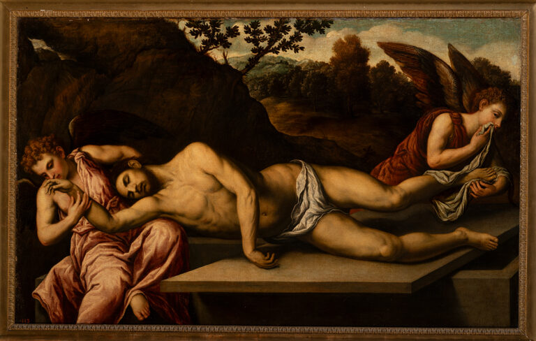 Some believe that Bordone painted this canvas for the Canececchi family in Treviso, where in 1648 Marco Boschini described seeing “a dead Christ with two angels holding him.” However, it should be noted that Bordone’s composition was quite popular, and at least two replicas by his assistants are known to exist: one formerly in the Gaggia Collection in Venice, and another at the Moravská Galerie in Brno dating to c. 1545-1555. Although the painting’s original provenance remains uncertain, its authorship is confirmed by Bordone’s body of work. Notably, his Mars and Venus Surprised by Vulcan, created between 1548 and 1551 and housed at the Staatliche Museen in Berlin, and the Sleeping Venus at the Galleria Borghese in Rome, dated to the late 1550s, provide strong stylistic parallels. This comparative analysis implies a dating for the Deposed Christ Supported by Angels in the 1550s.