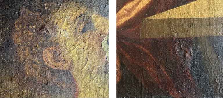 The 2024–2025 conservation treatment addressed several condition issues, including a thorough surface cleaning to remove the thick layers of surface grime and oxidized varnish that had given the work a darkened and yellowed appearance. Areas of lifting and buckled paint were meticulously secured, and small areas of abrasions that had resulted in losses to the pictorial surface were integrated with reversable conservation colors and glazes. A final protective surface varnish was applied as a final step in the treatment. The gilded frame was also treated to repair areas of lifting and flaking gilding, as well as removing surface grime.