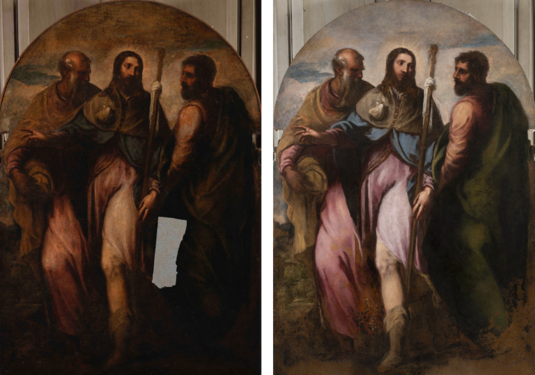 The canvas altarpiece was suffering from considerable condition problems and had been heavily overpainted in a previous restoration attempt. Conservators from the CBC Conservation Firm removed the layers of oxidized varnishes and heavy overpainting, before filling any losses with more ideal conservation paints and applying a final protective varnish. The painting was reinstalled on the altar in December 2019.