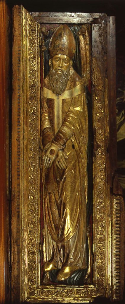 This horizontal bas-relief depicting the reclining body of Saint John the Almsgiver originally formed the lid of the box containing the relics of the saint, which were given to the church of San Giovanni in Bragora in 1249 by Lorenzo Bragadin. Despite the fact that there was another church in Venice already dedicated to the saint, located near the Rialto bridge, the relic remained in the Bragora church because of its miraculous power and the growing devotion surrounding it. The relief carving is the work of Lardo (also occasionally known as Leonardo) Tedesco, while Leonardo Boldrini was responsible for the polychromy and gilding.