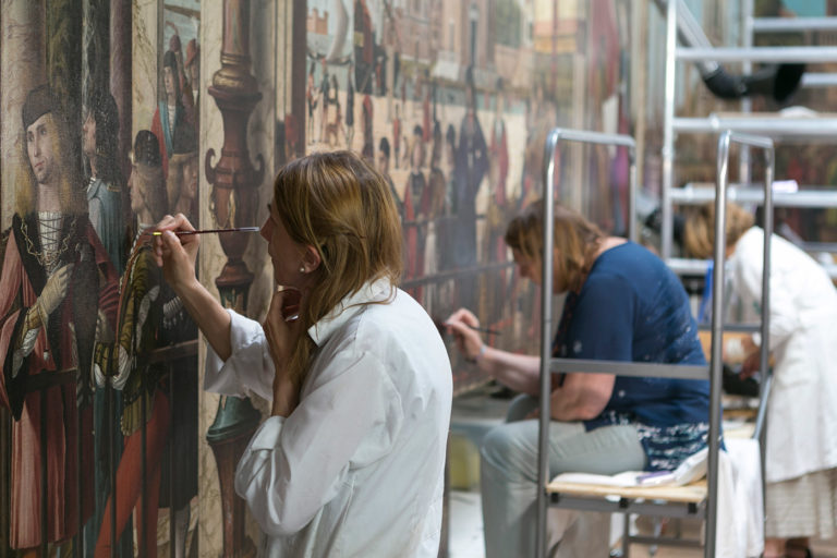 Founded in 1451 by a group of Dalmatians residing in Venice, this lay confraternity is one of the few to have endured through the centuries and remains active to this day. Save Venice’s collaboration with the Scuola began in 2001–2004 with the restoration of its façade, followed by a second treatment of the front and side facades in 2024. Since 2019, Save Venice has funded the ongoing conservation of Vittore Carpaccio’s celebrated narrative cycle (c. 1501-1512) on the ground floor. Visit with Save Venice’s expert staff to see the transformational treatment of Carpaccio’s Calling of Matthew, Agony in the Garden, Vision of Saint Augustine, Saint George and the Dragon, Saint Jerome and the Lion, the Funeral of Saint Jerome, and the Triumph of Saint George and learn more about the history of this fascinating confraternity.