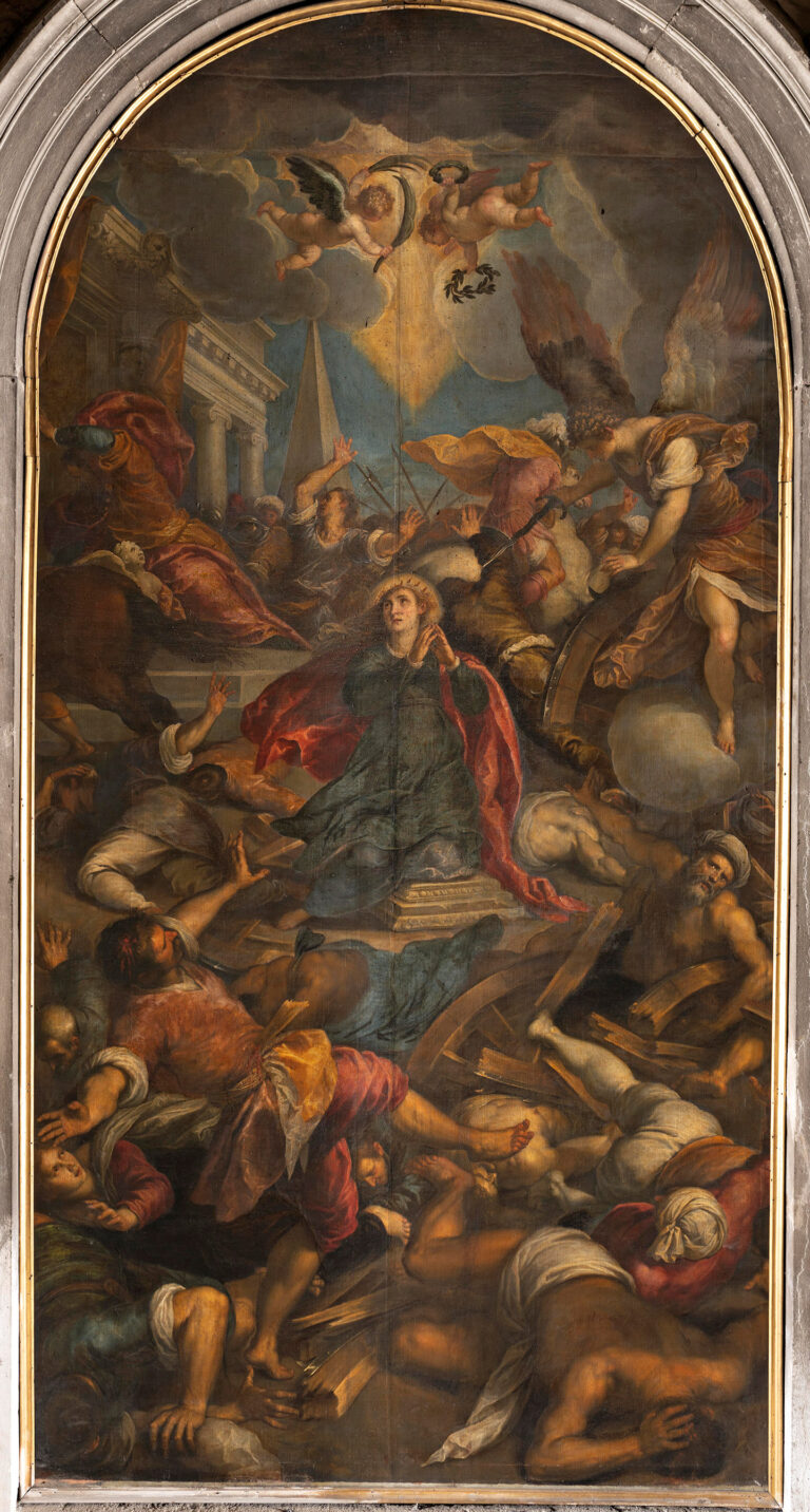 This large painting depicts the martyrdom of Saint Catherine of Alexandria, at the moment in which she is spared from torture at the wheel. In true Mannerist style, a cast of characters in unnatural poses fall away from Catherine in disorderly disbelief, awed by the breaking wheel that shattered at her touch. Dark clouds part and angels descend to bestow the martyr’s palm upon Catherine as she prays before her beheading, the punishment inflicted for refusing to renounce her faith in Christ. The painting is housed in a marble and stone altar on the right side of the nave of the Basilica dei Frari, across from Titian’s Madonna di Ca’ Pesaro.