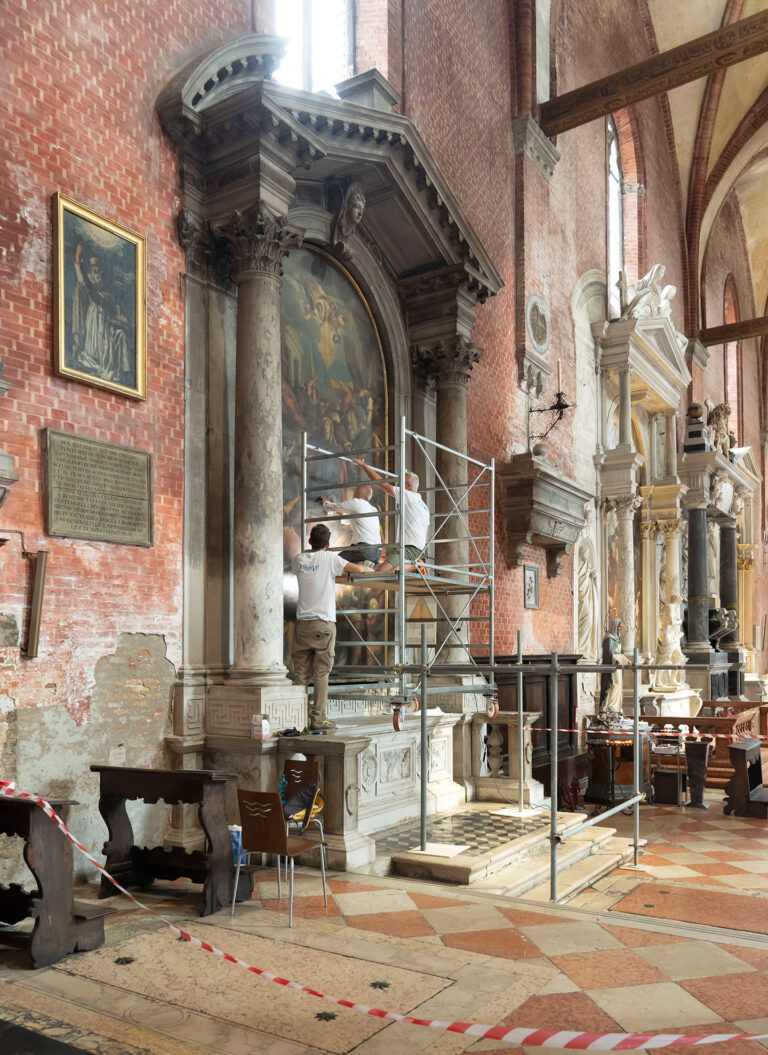 Save Venice’s conservation campaign also focused on the painting’s marble frame and altar, which had also been obscured by a thick layer of grime. Conservator Egidio Arlango and the Arlango firm carefully examined and verified the structural stability of the altar before cleaning the stonework. The results of the cleaning were particularly evident on the Pavonazzetto marble columns, whose distinctive purple veins are now once again visible.