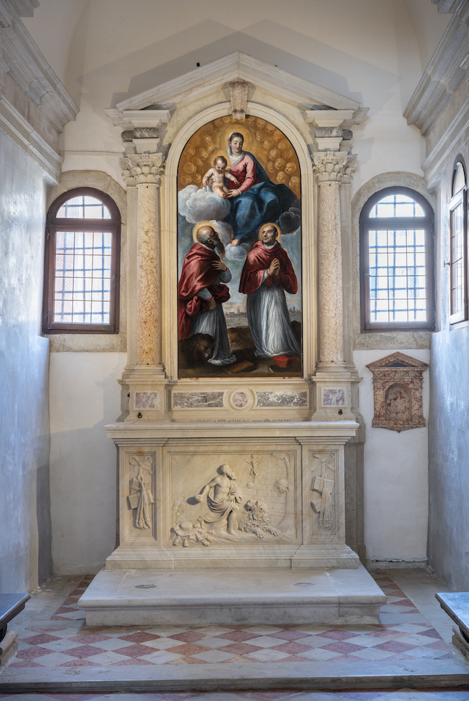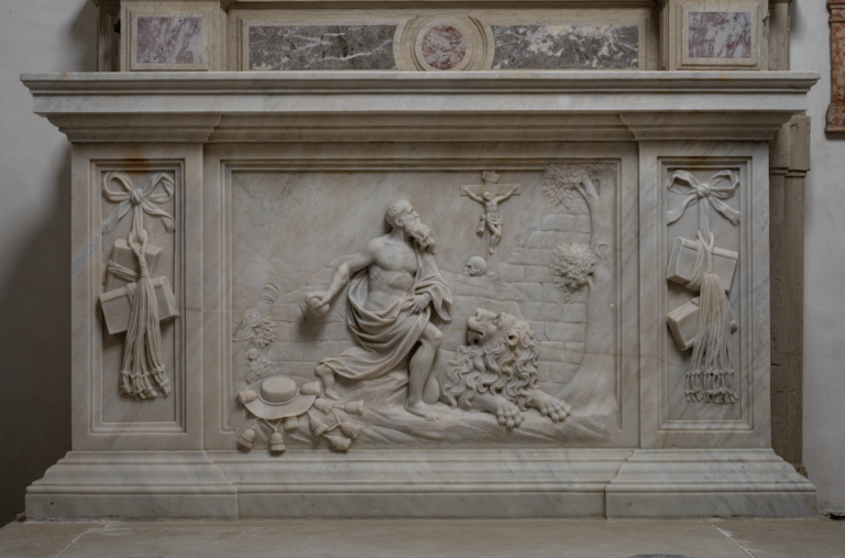 The chapel also features a remarkable marble altar front representing Saint Jerome in the Wilderness carved by Pietro Baratta, of whom Save Venice restored the Pietà at the Istituto Canal-Marovich. Originally from Carrara, in Tuscany, during his career Baratta worked in Venice, Rome, Dresden, and Saint Petersburg. The relief in San Sebastiano has recently been compared to a Bust of Saint Jerome attributed to Baratta and carved in white Carrara marble (Museo Diocesano, Padua). Even more striking is the resemblance with the Saint Jerome in the Wilderness that Baratta made for the church of Santa Giustina, Monselice (c. 1720), in which both the pose of the anchorite and the setting of the scene are almost identical.