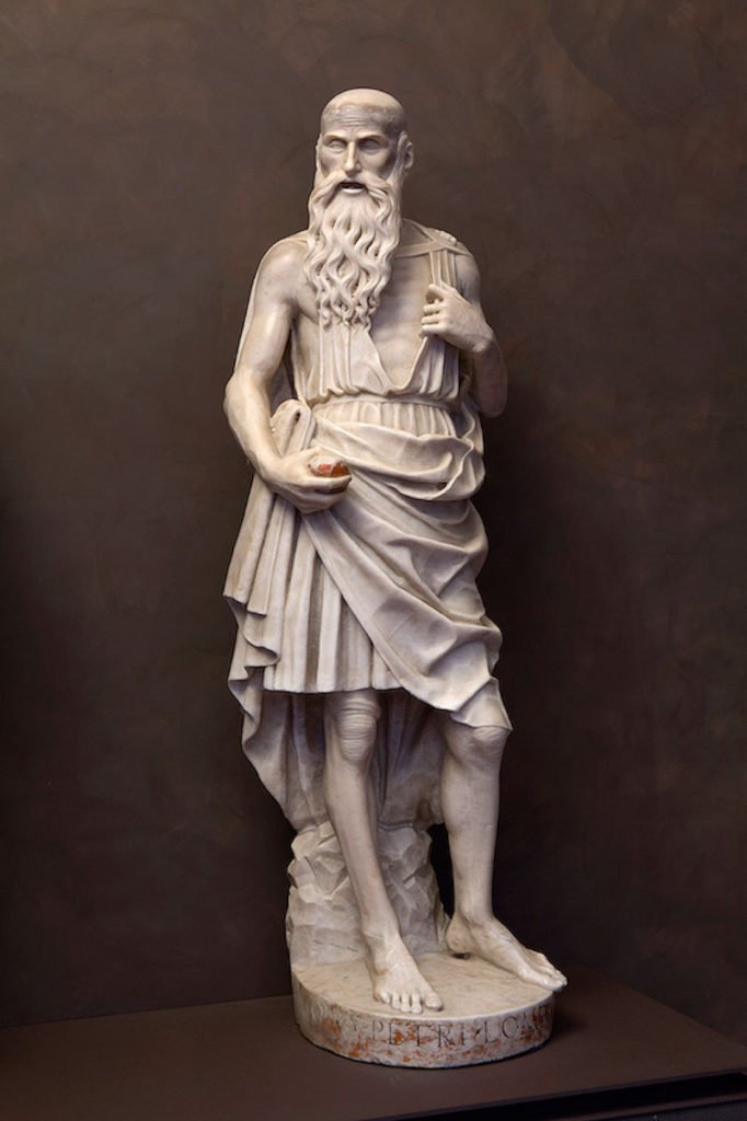 Saint Jerome is signed by Pietro Lombardo himself along the base of the sculpture. The figure is rendered in sensitive detail, from the fine carving of his beard to the vivid wrinkles on his knees. He draws back his garment with his left hand, bearing his chest, as he prepares to left the rock of his self-flagellation that he clutches in his right hand.