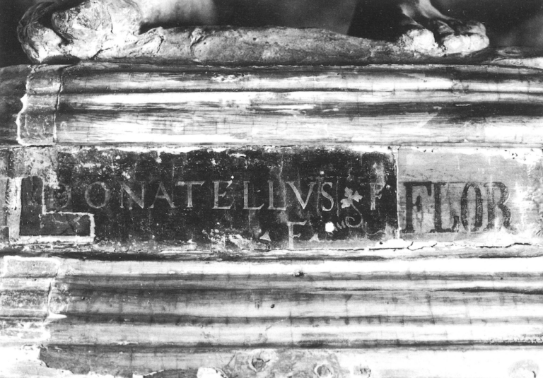 During restoration, conservators uncovered an inscription on the base of the sculpture that bears the date of execution and the artist’s signature: “MCCCCXXXVIII / OPUS / DONATI DE / FLO RENTIA,” or “1438, work of Donato of Florence.” This discovery resolved a centuries-long scholarly debate regarding the dating of the sculpture.