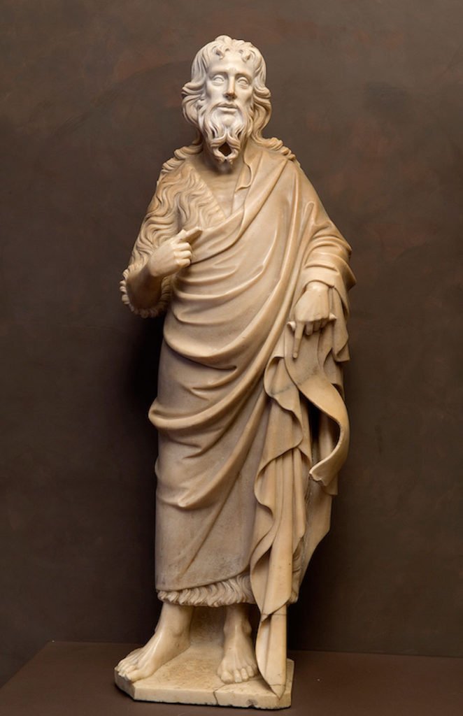 The original location of these sculptures in the church of Santo Stefano is unknown, but they must have been installed inside a niche or directly against a wall because the back of each sculpture is unfinished. Saint John the Baptist, barefoot and wearing a cape over his traditional animal-hair tunic, points to his prophetic scroll preaching the coming of the Lamb of God. The Franciscan Saint Anthony of Padua holds in his left hand the book of the word of God; his right hand may have originally held a lily similar to the later one that he currently holds, which became his traditional attribute.