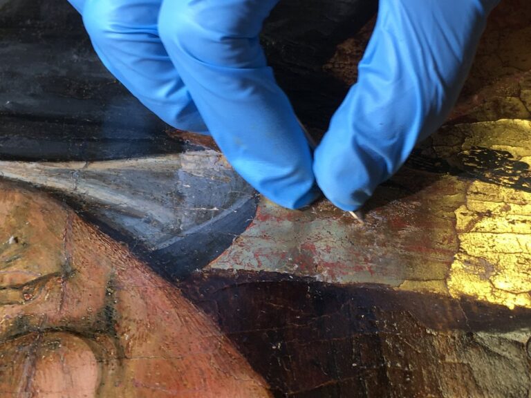 Beginning in February 2019, conservator Claudia Vittori first consulted with a team of imaging specialists and scientists to complete a full diagnostic campaign, which provided further insight into the artist’s working methods, the painting’s original composition, and the materials used during previous interventions. The results of this analysis allowed her to determine the best methods for treating the painting, removing detrimental non-original surface residues and the remaining heavy overpainting while protecting the fragile painted layer and restoring the artist’s original details . Panel painting specialist Roberto Saccuman carefully repaired the wooden structural support of the frame and the backing of the panel, ensuring it was safeguarded for many decades to come. Following conservation, the painting was reinstalled in the Palazzo Cini Gallery in January 2020.