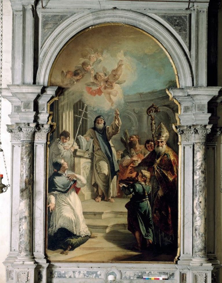 Francesco Fontebasso apprenticed with Sebastiano Ricci (1639–1754) and was also a follower of Giovanni Battista Tiepolo (1698–1770). Fontebasso’s theatrical illumination focuses the viewer’s attention upon the main protagonist, Saint Leonard. The other figures in the altarpiece include Saints Andrew, Lorenzo Giustiniani, and Nicholas of Bari. The latter two were particularly venerated by the local population, for Lorenzo Giustiniani was a Venetian saint and the first patriarch of the city, and relics of Nicholas of Bari were housed in Venice at San Nicolò al Lido.
