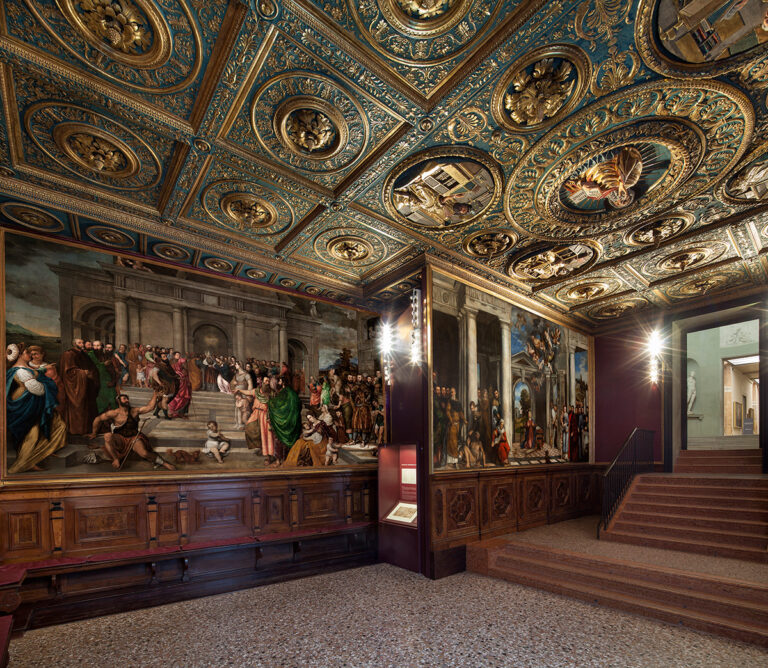 The Sala dell’Albergo, now Room XXIV of the Gallerie dell’Accademia, was originally the boardroom of the Scuola Grande di Santa Maria della Carità, one of the most powerful charitable confraternities in Venice. The officers of the Carità confraternity held their meetings in this richly decorated room and an upstairs space reached via a fifteenth-century wooden spiral staircase, also once kept the Scuola’s registers, statutes, and reliquaries.