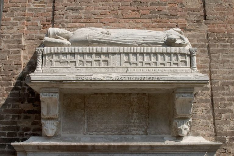 Giovanni Priuli, who lived during the fourteenth century, was a prominent member of the Venetian nobility; in addition to his military career, he also served as a senator. The effigy of Priuli on the tomb depicts him in civilian clothes, reclining on a sarcophagus with a carved cushion supporting his head. His feet rest on a small dog, a symbol of fidelity frequently employed in Gothic funerary statues. The front of the tomb is decorated with geometric patterns of squares and arches, while spiraled columns mark the corners. The date of Priuli’s death, November 17, 1375, is inscribed on the shelf supporting his stone coffin.