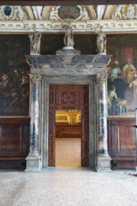 The Sala delle Quattro Porte is one of the most remarkable public spaces of the Palazzo Ducale, in fact one whose design and decoration involved some of the major artists in Venice, including Palladio, Tintoretto, Titian, Tiepolo, and Vittoria. A large rectangular hall, it stands as a passageway into the four rooms where Venice’s most powerful political bodies used to meet: the halls of the Senate, Collegio, Council of Ten, and Cancelleria.