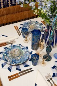 The collection recalls memories of Venice with linen placemats inspired by the floors of the Gallerie dell’Accademia and water glasses, pitchers, and candlesticks crafted exclusively for @modaoperandi by traditional Murano Glass master, David Fuin. This elegant collection features four distinct color stories to choose from and fully encapsulates the distinct traditions and talents of Venice and its artisans.
