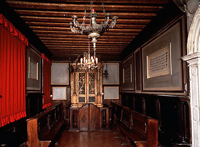 The interior of the Scuola Levantina, the synagogue built in 1689 by the Sephardic community in Venice, is noted for its finely carved woodwork, traditionally attributed to Andrea Brustolon (1662–1732) and his atelier.