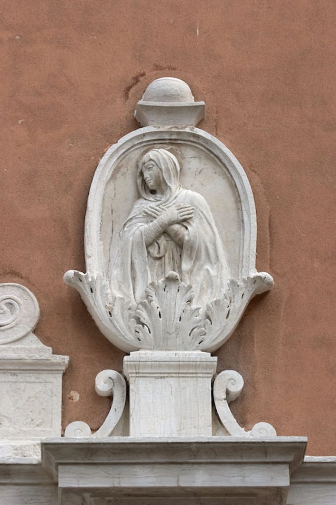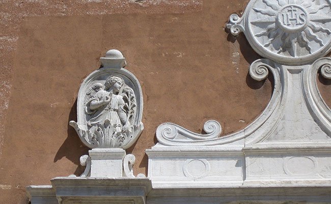 Three stone reliefs, encased in roundels, are located above the doorway. The first contains the letters IHS (the abbreviation of the name Jesus in Greek) in a disk surrounded by flames; this is the symbol of San Bernardino, a canonized Franciscan friar from Siena who also preached in Venice. The remaining reliefs depict the Archangel Gabriel and the Virgin Mary in a scene of the Annunciation. The frieze above the doorway is decorated with a central cross, and Jerusalem crosses appear above the two side columns. The Jerusalem cross was first used as a coat of arms for the Latin kingdom in Jerusalem. During the Crusades it was referred to as as the Crusader’s cross, the symbol of a Christian warrior. It is composed of four small crosses surrounding one large cross. Two Istrian stone lion heads, set in roundels, decorate the doorway’s pilasters. The Trevisan and Marcello coats of arms decorate the pedestals of the doorway columns.