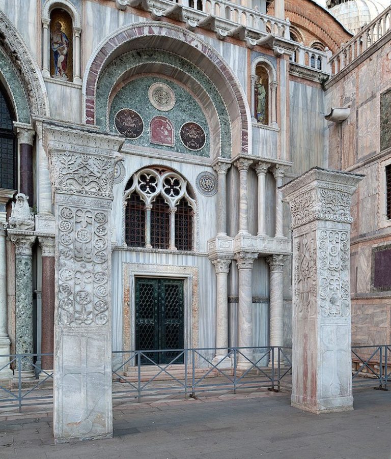 These carved marble pillars have flanked the ceremonial entrance to the Basilica di San Marco, located on the Piazzetta, for centuries. Traditionally referred to as the Pillars of Acre (Pilastri Acritani in Italian), they were once thought to have originated from the city of the same name in the eastern Mediterranean, and to have been taken as trophies commemorating the victory of the Venetian fleet over the Genoese in 1258.
