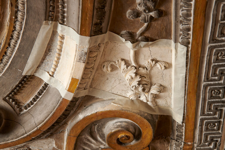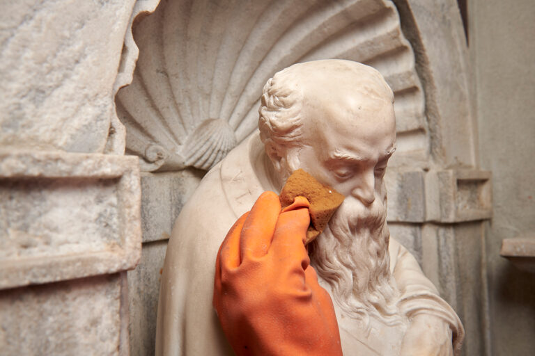 From 2017 to 2018, the Co.New Tech firm primarily concentrated its efforts on the conservation of the stuccowork and frescoes in the vault and lunette. Thanks to stratigraphic studies undertaken using X-ray fluorescence (XRF) technology, traces of the original 16th-century colors of the stucco decoration were identified beneath several layers of overpainting from previous interventions over the centuries. Conservators were able to safely remove these non-original layers, restoring Andrea Schiavone’s original color palette. Schiavone’s frescoes were cleaned, and areas of heavy overpainting were removed, revealing more of the original details and figures. Any cracks or fissures were consolidated and filled, ensuring that the chapel’s decoration is preserved well into the future. The marble elements and sculptures were also cleaned and found to be in good condition.